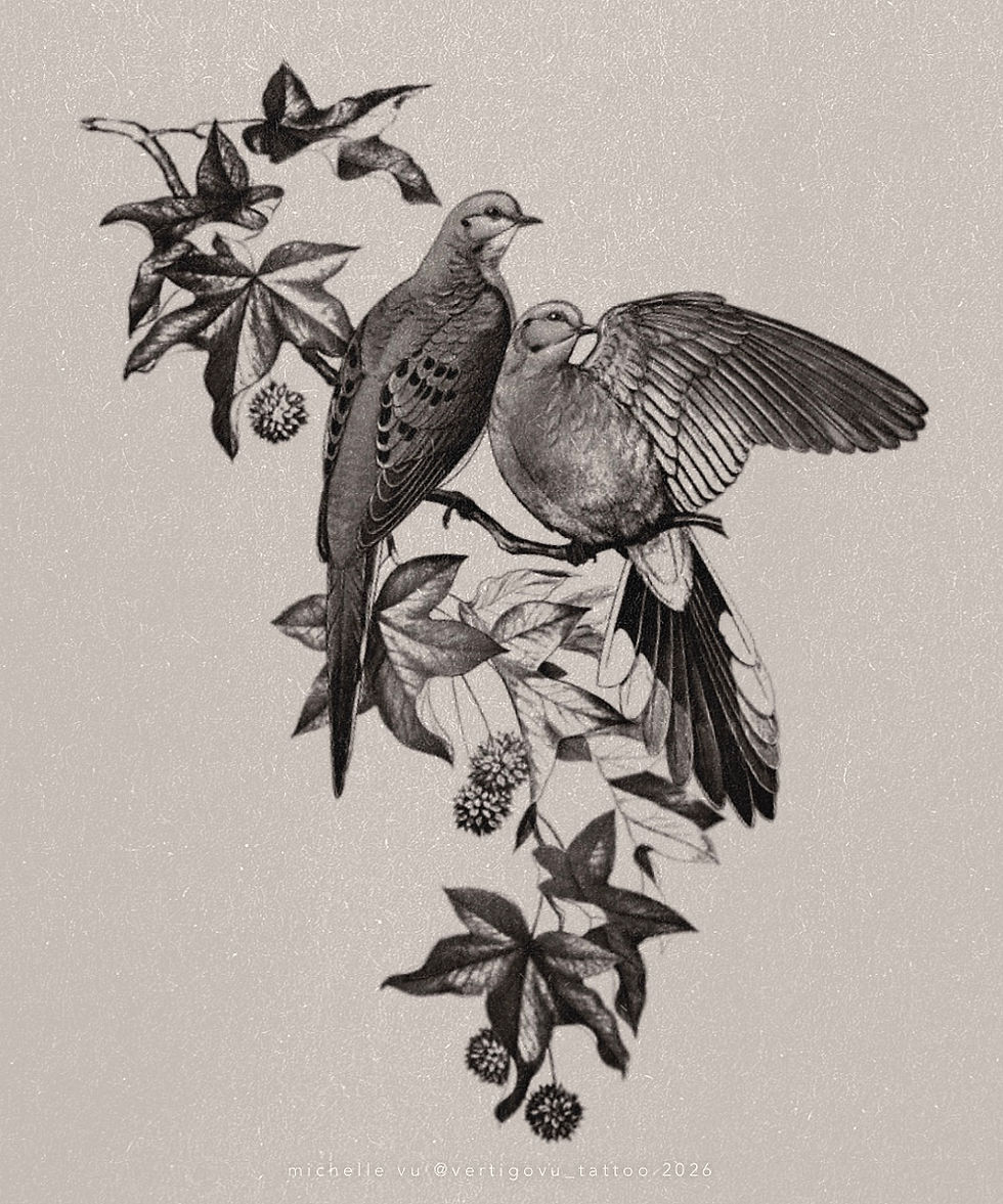 This will be my adaptation of a vintage illustration of mourning doves by Athos Menaboni. There will likely be some rearranging of leaves and branches to fit the client’s body.