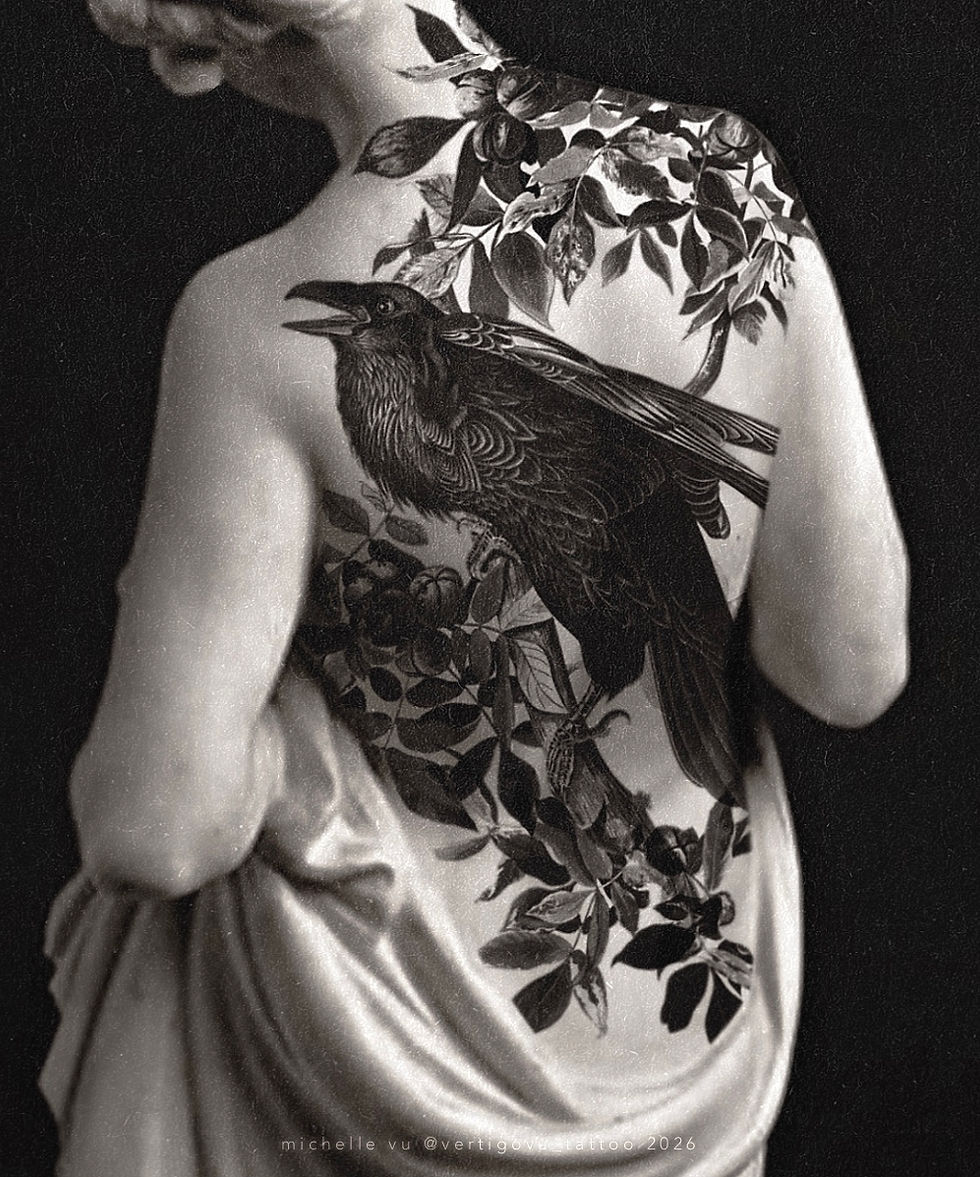 This is my adaptation of John James Audubon's original raven illustration. There will likely be some rearranging of leaves and branches to fit the client's body.